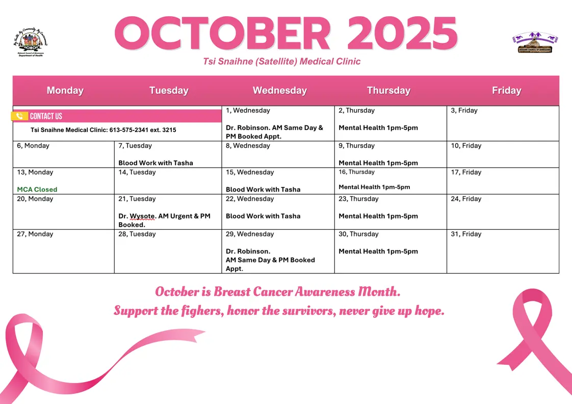 Clinics are open Monday to Friday from 8:00 a.m. to 4:00 p.m., with additional Saturday appointments now available at the Kawehno:ke Medical Clinic.