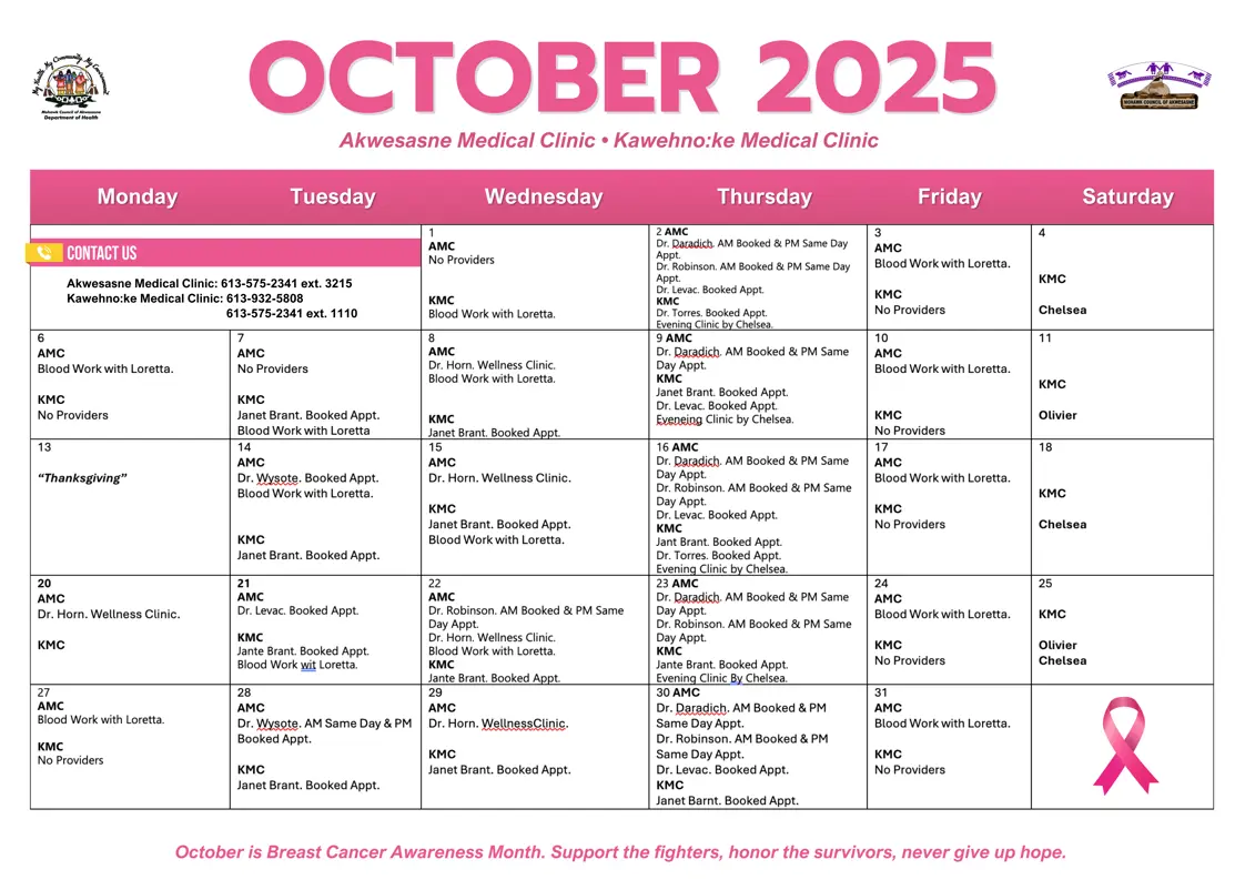 The Mohawk Council of Akwesasne’s Department of Health is committed to providing accessible, high-quality primary care across all three districts of Akwesasne. Medical services are offered at the Akwesasne Medical Clinic (AMC), the Kawehno:ke Medical Clinic (KMC), and the Tsi Snaihne Medical Clinic (TMC) — a satellite site currently operating out of Iakhihsohtha Lodge.