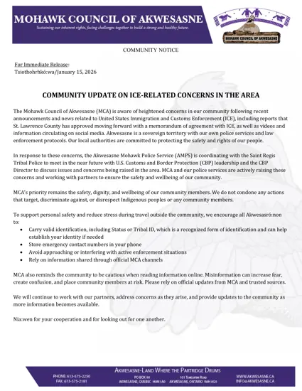 The Mohawk Council of Akwesasne (MCA) is aware of heightened concerns in our community following recent announcements and news related to United States Immigration and Customs Enforcement (ICE), including reports that St. Lawrence County has approved moving forward with a memorandum of agreement with ICE, as well as videos and information circulating on social media. Akwesasne is a sovereign territory with our own police services and law enforcement protocols. Our local authorities are committed to protecting the safety and rights of our people.