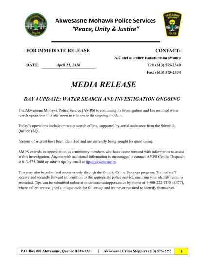 The Akwesasne Mohawk Police Service (AMPS) is continuing its investigation and has resumed water search operations this afternoon in relation to the ongoing incident.