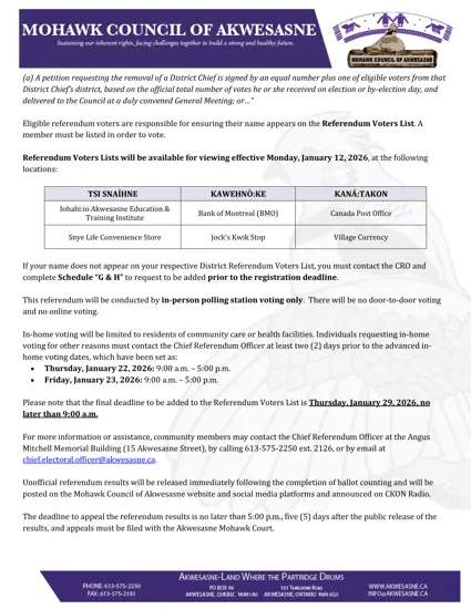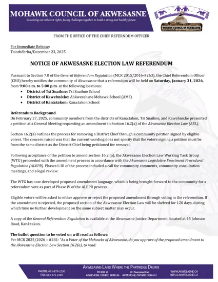 Pursuant to Section 7.0 of the General Referendum Regulation (MCR 2015/2016-#263), the Chief Referendum Officer (CRO) hereby notifies the community of Akwesasne that a referendum will be held on Saturday, January 31, 2026, from 9:00 a.m. to 5:00 p.m. at the following locations: