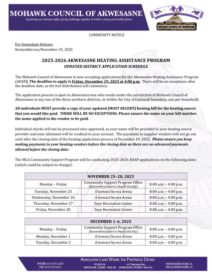 The Mohawk Council of Akwesasne is now accepting applications for the Akwesasne Heating Assistance Program (AHAP). The deadline to apply is Friday, December 19, 2025 at 4:00 p.m. There will be no exceptions after the deadline date, as the fuel distribution will commence.