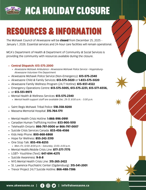 The Mohawk Council of Akwesasne’s (MCA) Department of Community & Social Services and Department of Health is providing the community with resources and information for services available during MCA’s holiday closure, scheduled for December 25, 2025 – January 1, 2026. Most of MCA’s programs will be closed, with the exception of 24-hour facilities. The Ahkwesahsne Mohawk Board of Education (AMBE) schools and services will also be closed for the holiday week during this time.