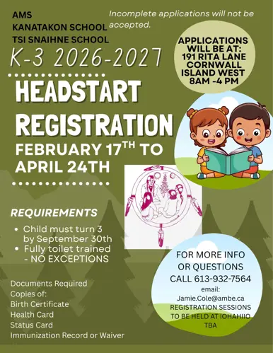Headstart registration sessions will also be available at Iohahi:io Akwesasne Education & Training Institute (dates to be announced).