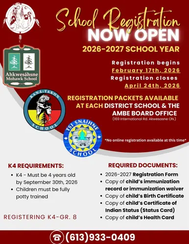 Registration packets for K4–Grade 8 are available at each district school and the AMBE Board Office (169 International Road, Akwesasne, ON). Completed applications must be returned to the school or Board Office.