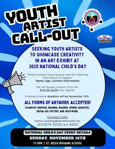 The Akwesasne Child & Family Services Traditional Support Unit is inviting youth artists to submit their artwork to be showcased in an art exhibit at the 2025 National Child Day celebration! All art styles and mediums are welcome, including painting, drawing, beading, sewing, basketry, digital art, pottery, and more.