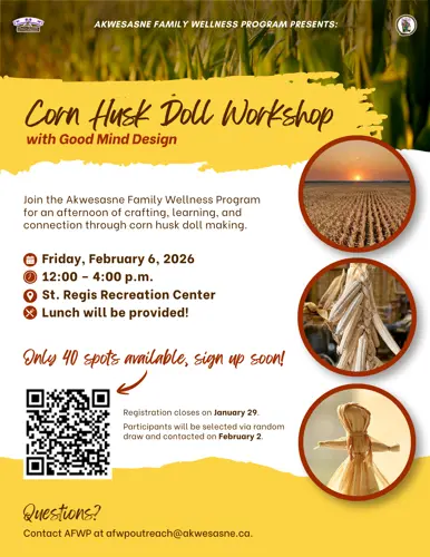 Registration closes on January 29. Participants will be selected by random draw and contacted on February 2. If you have any questions, please email afwpoutreach@akwesasne.ca. Â