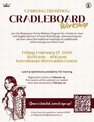 Explore the art and teachings of traditional cradleboards with the Akwesasne Family Wellness Program! Join Angello Johnson of Good Mind Design for a hands-on workshop and create your own cradleboard.