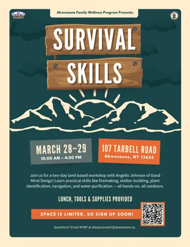 The Akwesasne Family Wellness Program (AFWP) is inviting community members to take part in a two-day survival skills workshop led by Angello Johnson of Good Mind Design. 🏕️