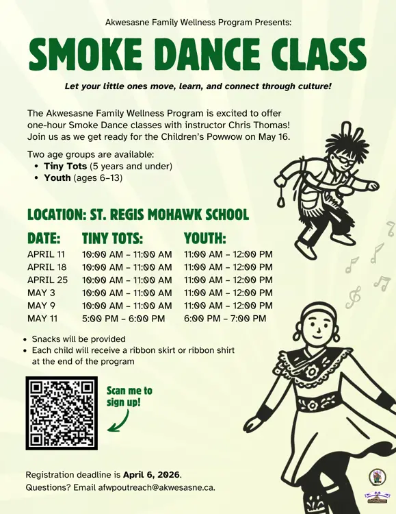 Classes will be held at the St. Regis Mohawk School Gym, running from April 11 to May 11, 2026. Spots are limited, so be sure to sign up early and include your child’s ribbon skirt/shirt size.