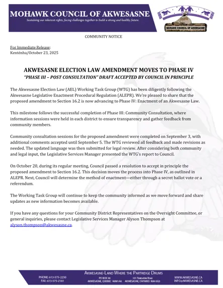 AKWESASNE ELECTION LAW AMENDMENT MOVES TO PHASE IV