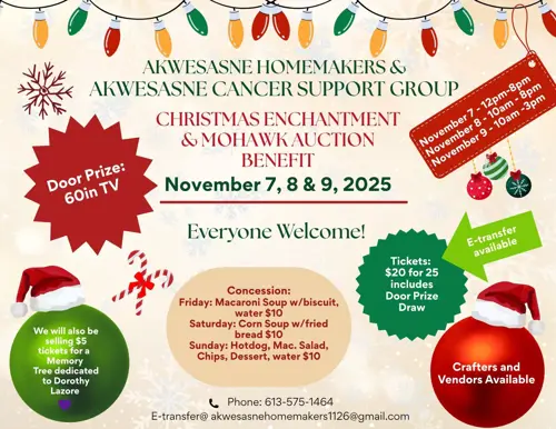 Stopping by Snye Recreation’s Christmas Enchantment this weekend? Don’t miss the Akwesasne Homemakers and Akwesasne Cancer Support Group’s Mohawk Auction Benefit!