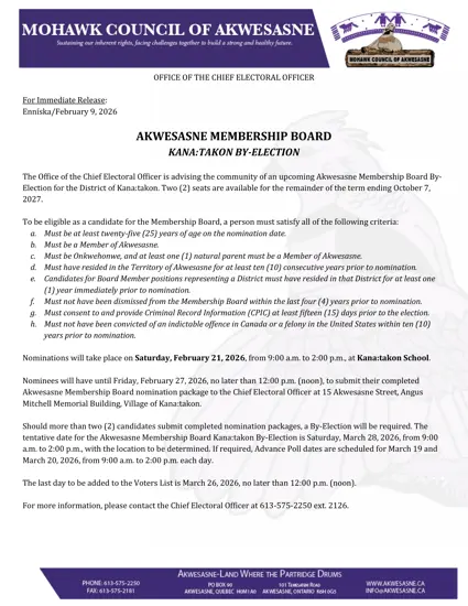 Nominees will have until Friday, February 27, 2026, no later than 12:00 p.m. (noon), to submit their completed Akwesasne Membership Board nomination package to the Chief Electoral Officer at 15 Akwesasne Street, Angus Mitchell Memorial Building, Village of Kana:takon.