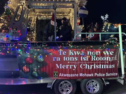 The Akwesasne Mohawk Police Service, including general patrol, SAVE Team members, and administrative staff, was proud to join Cornwall’s annual Santa Claus Parade and showcase the decorated Marine Unit for the community.