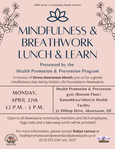 The MCA Department of Health’s Health Promotion & Prevention (HPP) Team will be hosting a Mindfulness & Breathwork Lunch & Learn on Monday, April 27 from 12:00 p.m. - 1:00 p.m. The workshop will take place in the HPP gym (bottom floor) at the Kanonhkwa’tsheri:io Health Facility.