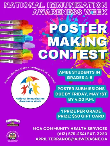 For more information, please call April Terrance, Immunization Coordinator, at 613-575-2341 ext. 3220 or by emailing april.terrance@akwesasne.ca.