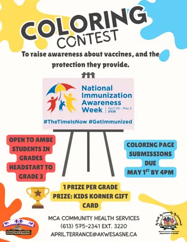 MCA Community Health Services will be hosting two contests to recognize NIAW: a coloring contest and a poster contest. Both contests are open to all students from grades Headstart up to Grade 8. Submissions for both contests are due by Friday, May 1 at 4:00 p.m. One prize is granted per grade.