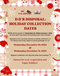 D&R Disposal will be closed on December 25, 2025 and January 1, 2026 so staff may enjoy the holidays with their families.