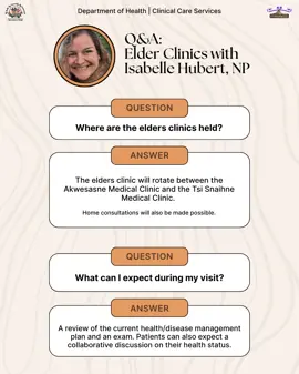 💬 Elders Clinics rotate between the Akwesasne Medical Clinic and the Tsi Snaihne Medical Clinic. Home consultations are also available when needed.Â