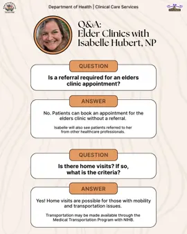 Do you have questions about the Elders Clinics with Nurse Practitioner Isabelle Hubert? We’ve gathered some of the most frequently asked questions from the community and shared the answers below to help you better understand what to expect.