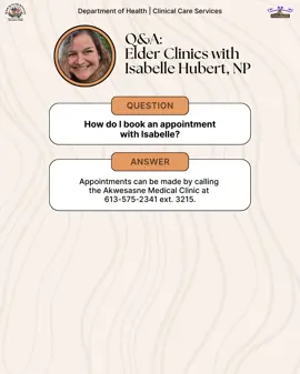 💬 To book an appointment with Isabelle Hubert, NP, please call the Akwesasne Medical Clinic at 613-575-2341 ext. 3215.
