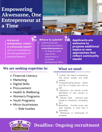 The Mohawk Council of Akwesasne’s Department of Economic Development is seeking experts to share their knowledge in areas such as: