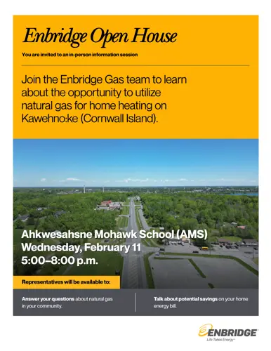 Community members are invited to attend an information open house hosted by Enbridge Gas to learn more about natural gas as a potential home heating option for residents of Kawehno:ke (Cornwall Island).