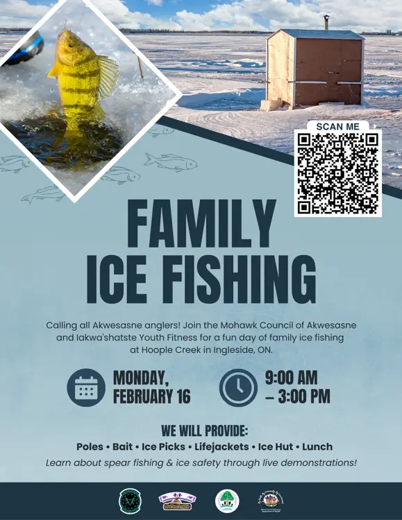 Calling all Akwesasne anglers — join the MCA Environment Program, MCA Health Promotion & Prevention, and Iakwa'shatste Youth Fitness for a free family ice fishing day at Hoople Creek in Ingleside, ON!