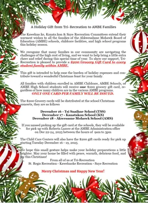 We recognize that many families in our community are navigating the challenges of the high cost of living, and we want to help bring a little extra cheer and relief during this special time of year. To show our support, Tri-Recreation is pleased to provide a $200 grocery gift card to every student family within AMBE.