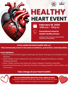 The MCA Department of Health’s Health Promotion & Prevention Team is hosting a Healthy Heart Event on February 18, 2026. The event will take place in the Kanonhkwa’tsheri:io Health Facility Atrium (bottom floor).