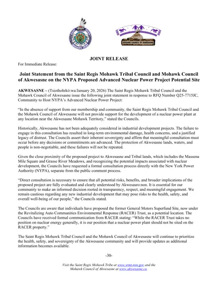 JOINT STATEMENT FROM THE SAINT REGIS MOHAWK TRIBAL COUNCIL AND MOHAWK COUNCIL OF AKWESASNE ON THE NYPA PROPOSED ADVANCED NUCLEAR POWER PROJECT POTENTIAL SITE