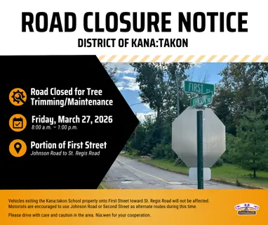 The MCA Department of Infrastructure, Housing & Environment (DIHE) would like to inform the community that First Street in Kana:takon will be closed from Johnson Road to St. Regis Road on Friday, March 27, from 8:00 a.m. to 1:00 p.m.