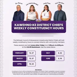 The Mohawk Council of Akwesasne would like to inform the community that the Kawehno:ke District Chiefsβ weekly constituency hours will now begin at 1:30 p.m., instead of 1:00 p.m.