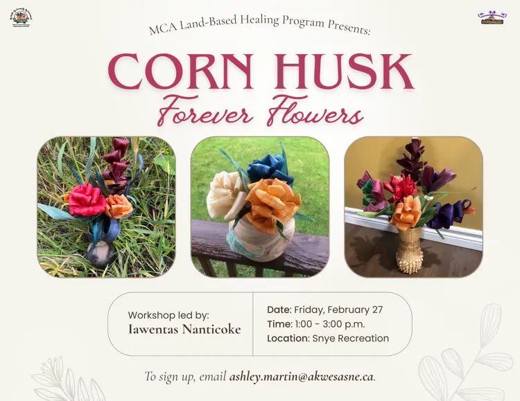 The MCA Land-Based Healing Program invites community members to a fun, hands-on workshop making “forever flowers” from corn husks! Led by Iawentas Nanticoke, this class is a great way to get creative, connect with culture, and try your hand at a traditional craft.