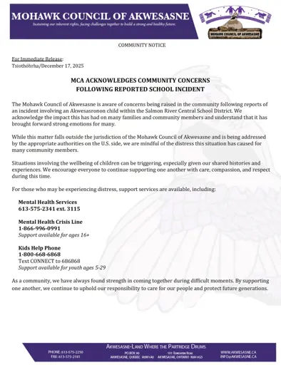 The Mohawk Council of Akwesasne is aware of concerns being raised in the community following reports of an incident involving an Akwesasronon child within the Salmon River Central School District. We acknowledge the impact this has had on many families and community members and understand that it has brought forward strong emotions for many.