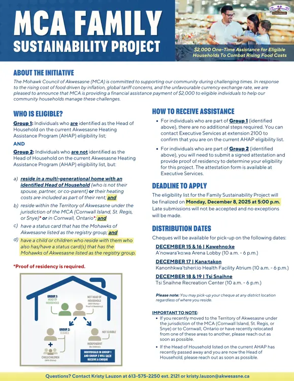 The Mohawk Council of Akwesasne is committed to supporting our community during challenging times. In response to the rising cost of food driven by inflation, global tariff concerns, and the unfavourable currency exchange rate, we are pleased to announce that the Mohawk Council of Akwesasne is providing a financial assistance payment of $2,000 to eligible individuals to help our community households manage these challenges.