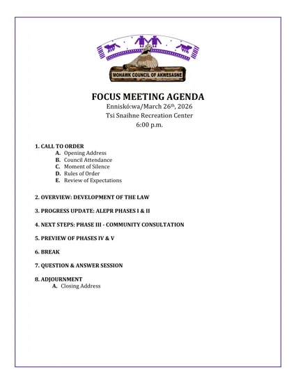 The Mohawk Council of Akwesasne’s Focus Meeting will take place on Enniskó:wa/March 26, 2026, at the Tsi Snaihne Recreation Center, beginning at 6:00 p.m.