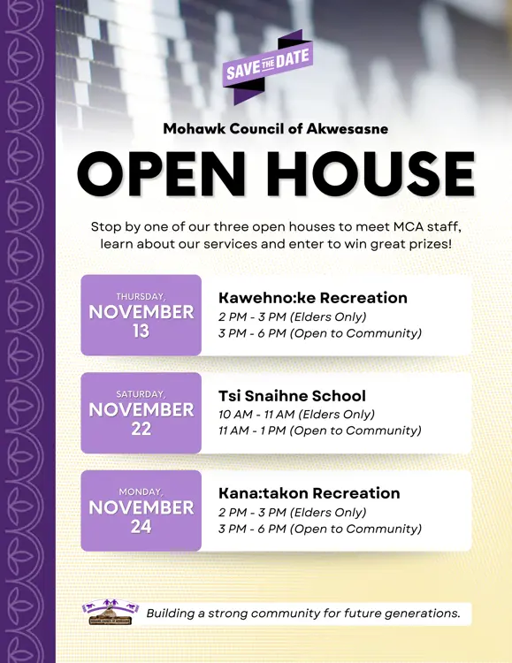 The Mohawk Council of Akwesasne welcomes community members to our 2025 Open House series — an opportunity to connect, learn, and engage with the many programs and services available to the people of Akwesasne.