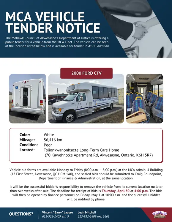 Vehicle bid forms are available Monday to Friday (8:00 a.m. – 5:00 p.m.) at the MCA Admin. 4 Building (13 First Street, Akwesasne, QC H0M 1A0).