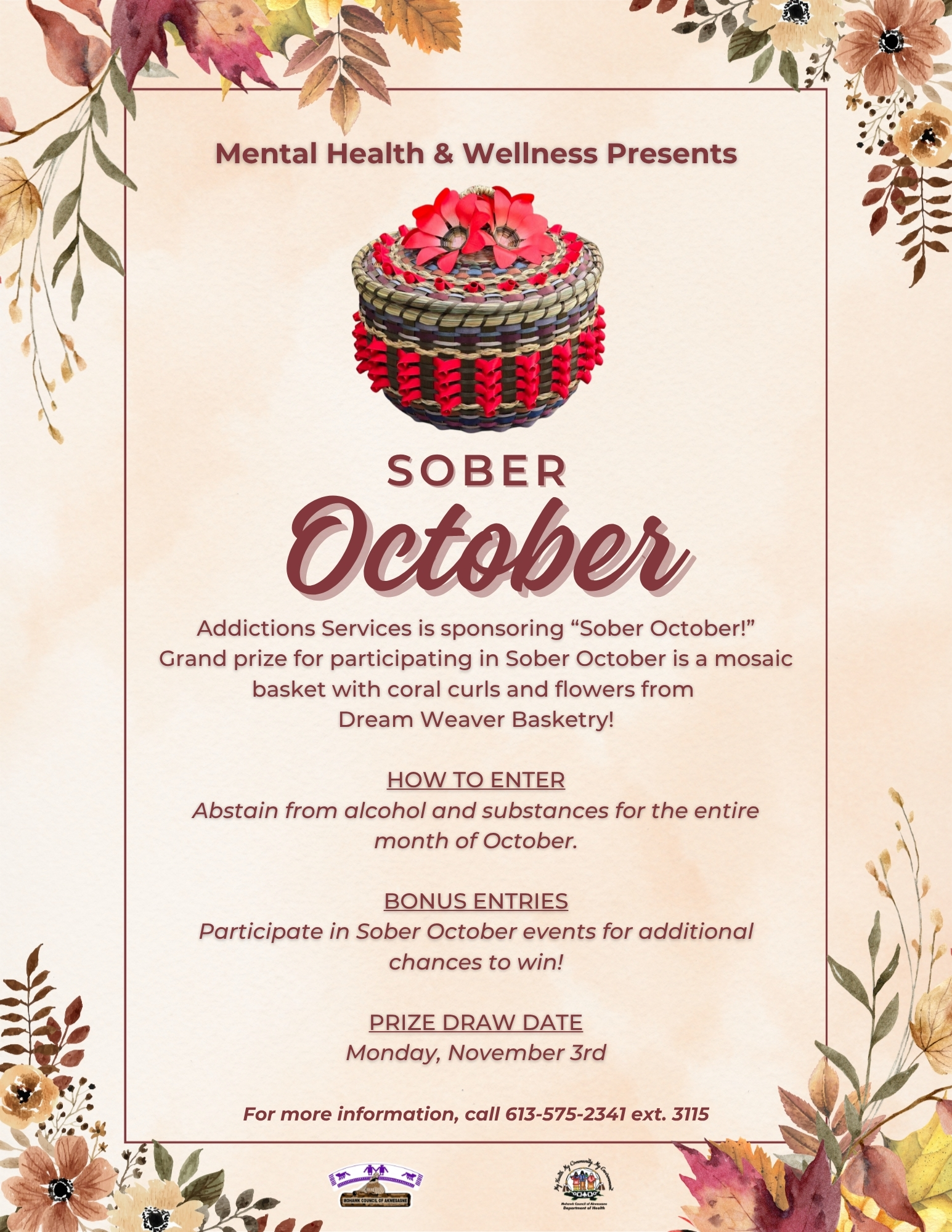 For more information on Sober October, the calendar of events, or entries for the Dream Weaver Basketry prize, please call 613-575-2341 ext. 3115.