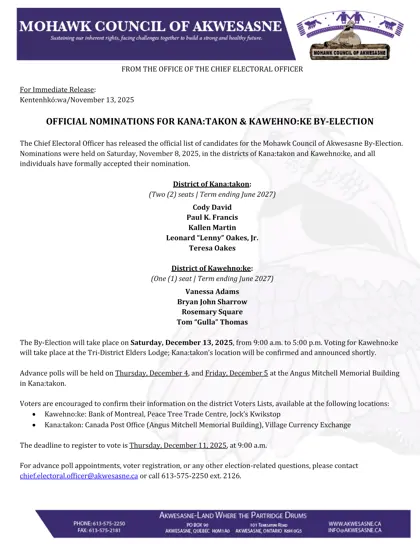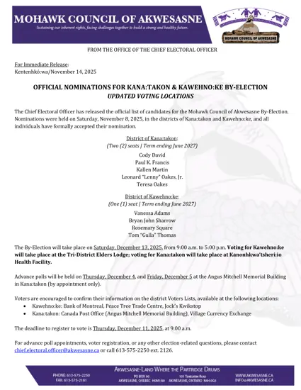 The Chief Electoral Officer has released the official list of candidates for the Mohawk Council of Akwesasne By-Election. Nominations were held on Saturday, November 8, 2025, in the districts of Kana:takon and Kawehno:ke, and all individuals have formally accepted their nomination.