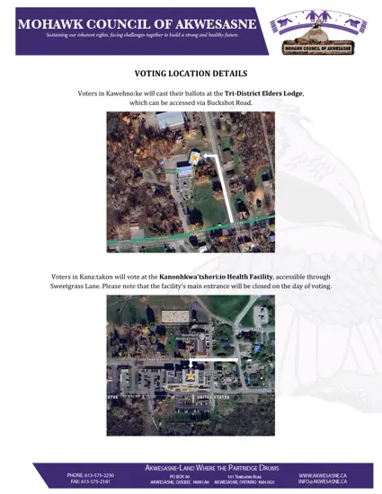 - Voters in Kana:takon will vote at the Kanonhkwa’tsheri:io Health Facility, accessible through Sweetgrass Lane. Please note that the facility’s main entrance will be closed on the day of voting.