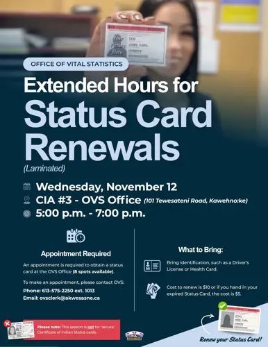 The Mohawk Council of Akwesasne’s Office of Vital Statistics (OVS) will be offering extended hours for laminated status card renewals.