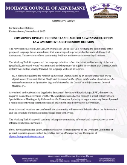 COMMUNITY UPDATE: PROPOSED LANGUAGE FOR AKWESASNE ELECTION LAW AMENDMENT & REFERENDUM DECISION