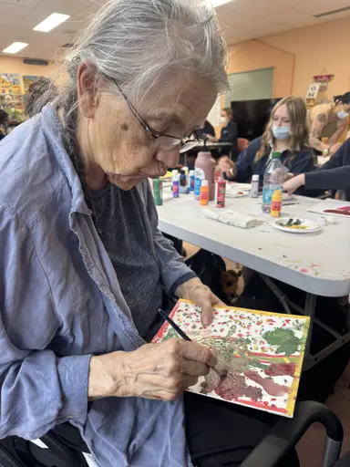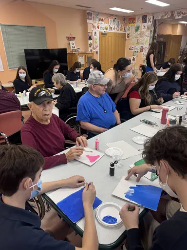 Following the presentations, students and residents came together for a shared painting session — laughing, creating, and learning from one another. The day wrapped up in the best way possible, with residents and students enjoying a meal together, celebrating new connections and shared memories.