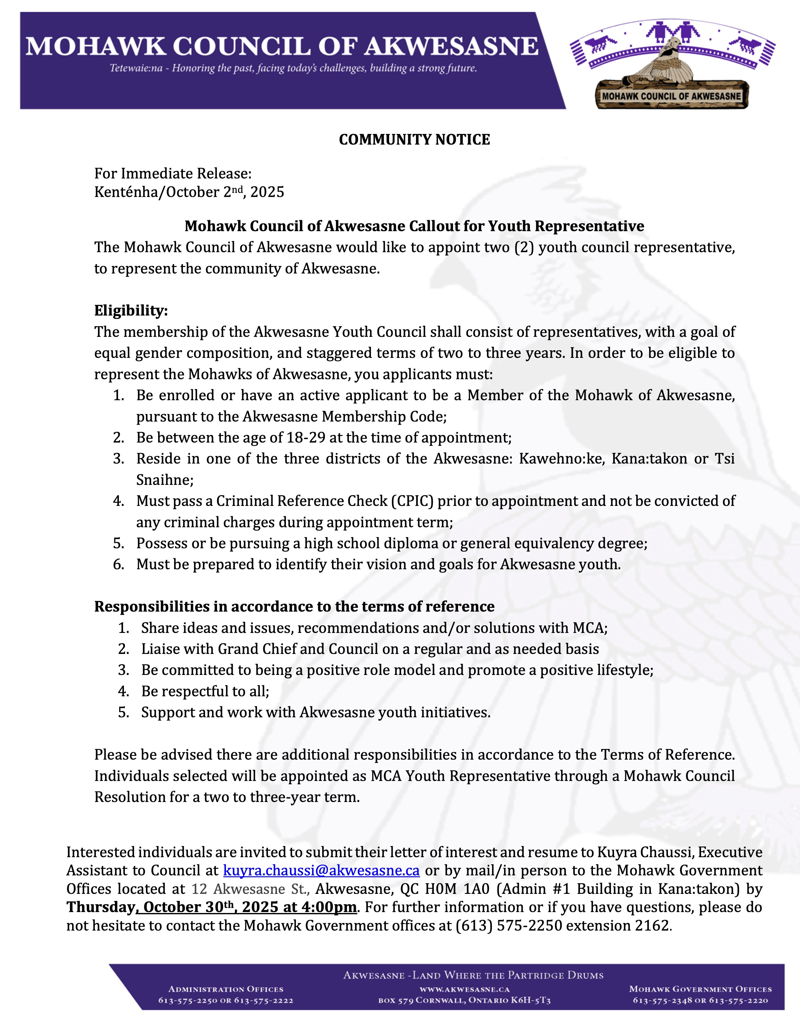 Interested individuals are invited to submit their letter of interest and resume to Kuyra Chaussi, Executive Assistant to Council at kuyra.chaussi@akwesasne.ca or by mail/in person to the Mohawk Government Offices located at 12 Akwesasne St., Akwesasne, QC H0M 1A0 (Admin #1 Building in Kana:takon) by Thursday, October 30th, 2025 at 4:00pm. For further information or if you have questions, please do not hesitate to contact