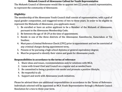Please be advised there are additional responsibilities in accordance with the Terms of Reference. Individuals selected will be appointed as MCA Youth Representative through a Mohawk Council Resolution for a two to three-year term.