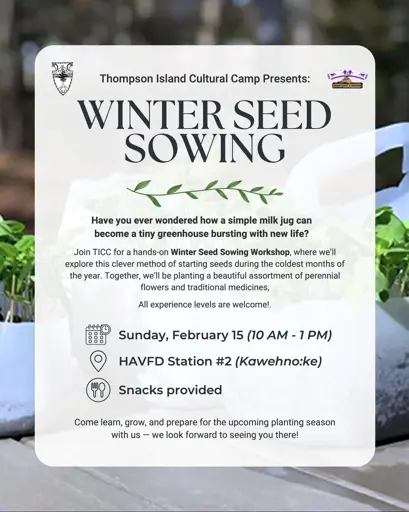 Thompson Island Cultural Camp (TICC) will be hosting a winter seed sowing workshop for the community! In this hands-on workshop, participants will discover how to transform everyday milk jugs into mini‑greenhouses – a great method to start seeds during the winter months.
