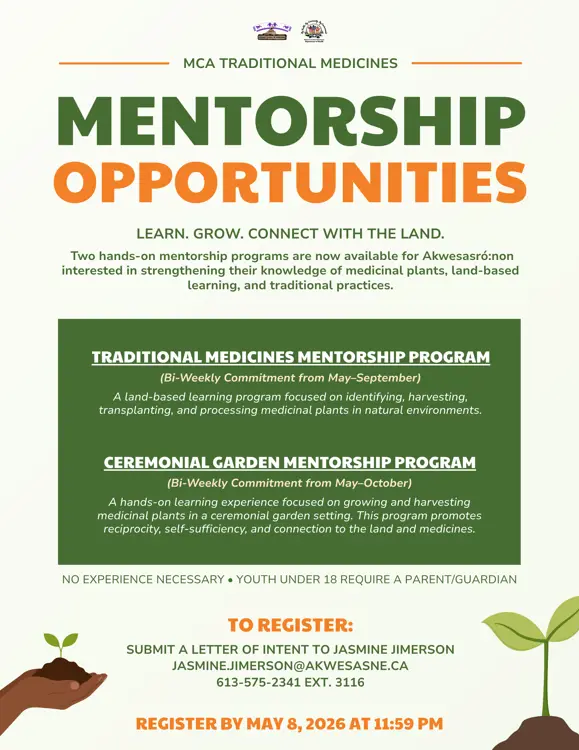The Mohawk Council of Akwesasne’s Traditional Medicines Program is offering two hands-on mentorship opportunities designed to support learning, land-based knowledge, and connection with medicinal plants, while strengthening relationships with the land, our medicines, and one another.