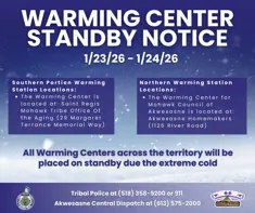 Due to the forecasted period of extreme cold temperatures, warming centers will be placed on standby from Friday, January 23, 2026 at 6:00 PM through Saturday, January 24, 2026 at 4:00 PM. Forecasted wind chills ranging from 20 to 40 below zero can cause frostbite on exposed skin in as little as 10 minutes.